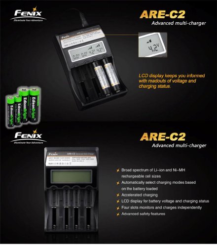 Fenix ARE-C2 four bays Li-ion/ Ni-MH advanced universal smart battery charger, Three Fenix 18650 ARB-L2S 3400mAh rechargeable batteries (For PD35 PD32 TK22 TK75 TK11 TK15 TK35 TK51) with EdisonBright Batteries sampler pack