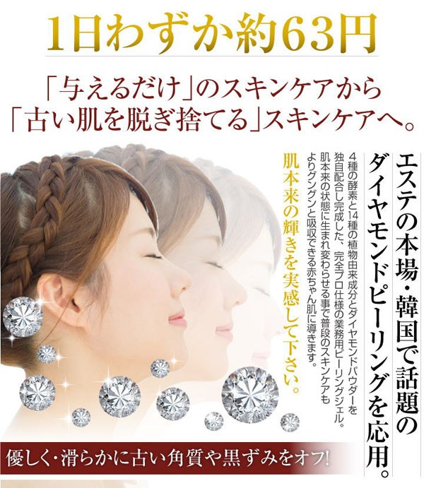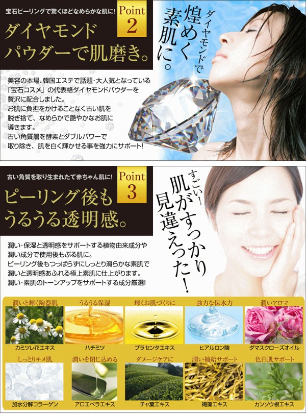 水、グリセリン、DPG、(アクリレーツ/アクリル酸アルキル(C10-30))クロスポリマー、ステアリルトリモニウムブロミド、ジココジモニウムクロリド、カミツレ花エキス、ハチミツ、プラセンタエキス、加水分 解シルク、ヒアルロン酸Na、ダマスクバラ花油、加水分 解コラーゲン、グルコース、リンゴ酸、乳酸、パパイン、リパーゼ、ブロメライン、マンゴー果実エキス、ダイヤモンド末、アロエベラ葉エキス、チャ葉エキス、褐藻エキス、カンゾウ根エキス、BG、グリチルリチン酸2K、クエン酸、イソプロパノール、フェノキシエタノール |