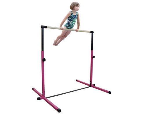 The adjustable horizontal bar has a base that is 4ft wide and adjusts from 3ft-5ft in 6in increments. The wood bar is 1-1/2 in diameter and made from hard poplar wood. The design includes rubber base caps and adjustable lock bolts. Powder coated pink to be rust resistant. The weight limit for the horizontal bar is 100lbs and without base extensions, is intended for gymnastic levels 1-4.