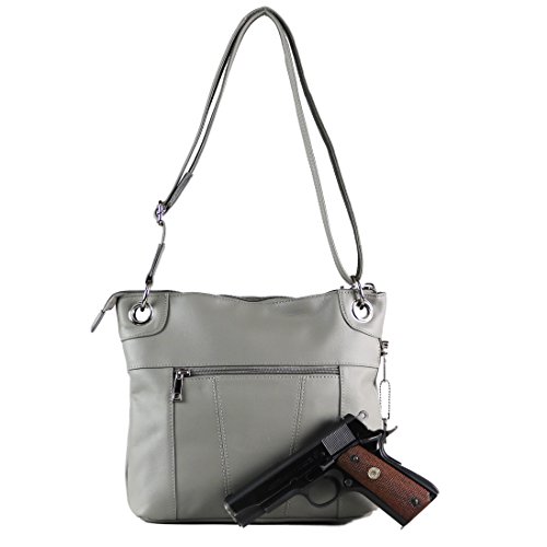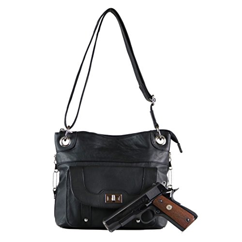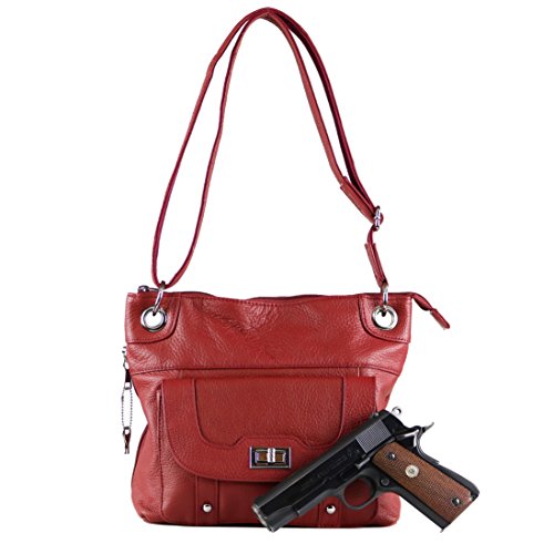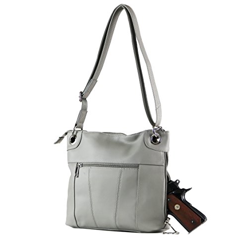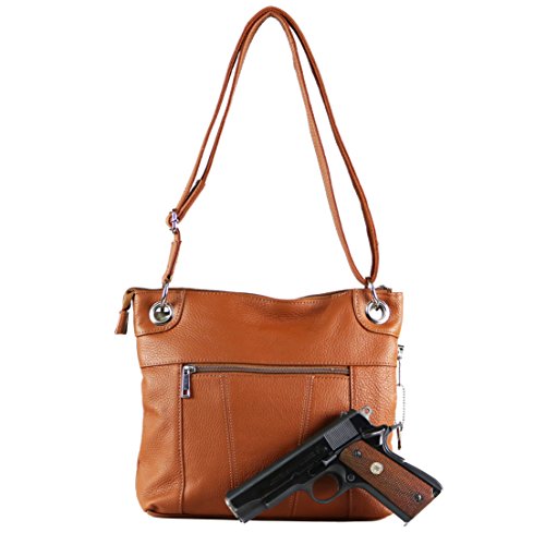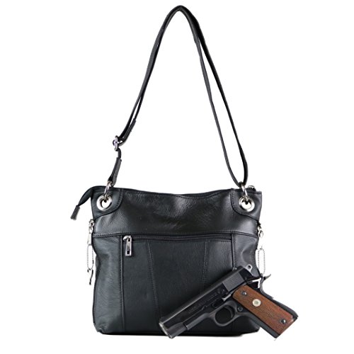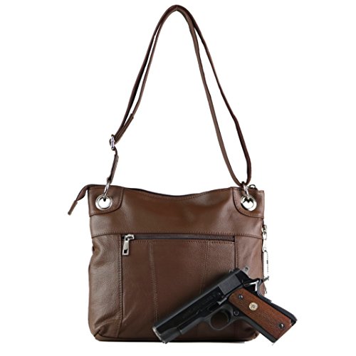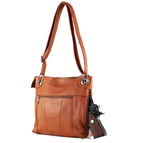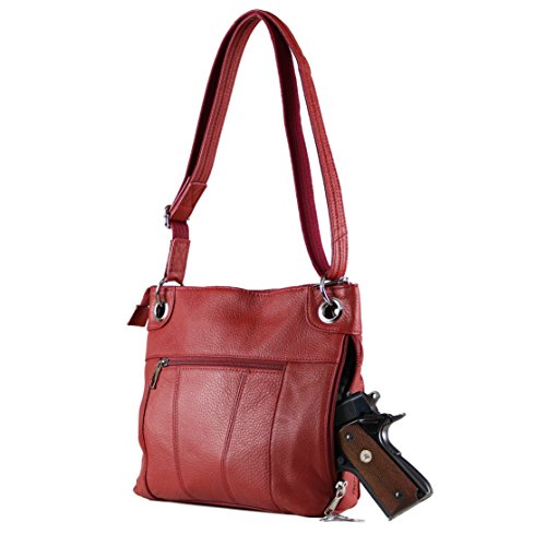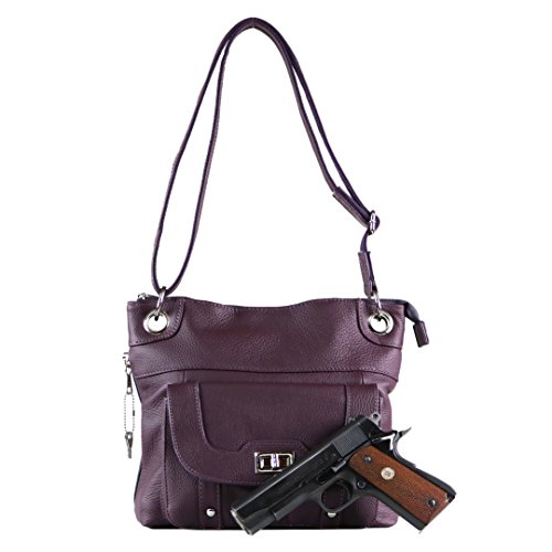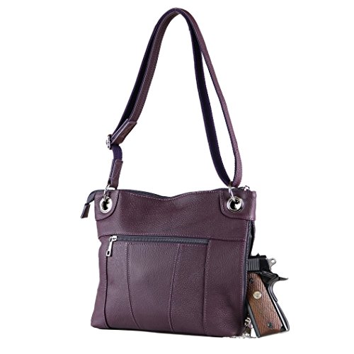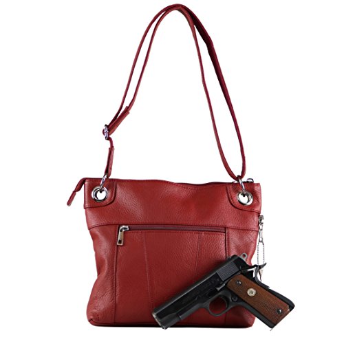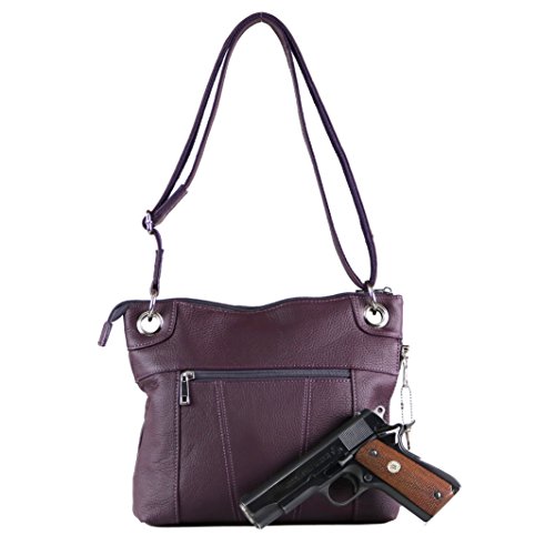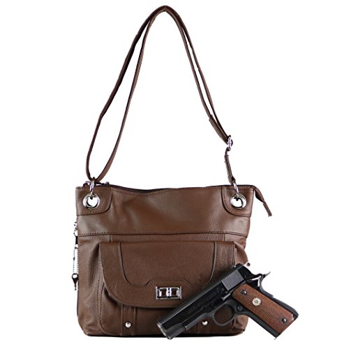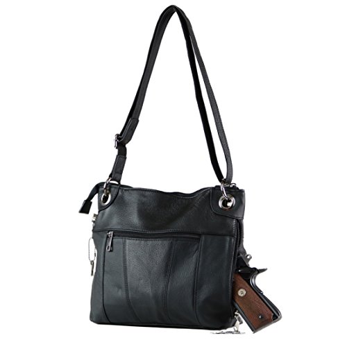 Product Description Product Summary: Just because you carry a handgun doesn't mean you need to sacrifice style for safety. This attractive concealed carry crossbody bag by Roma Leathers is crafted with premium top grain leather and features a decorative front flap pocket with a twist lock buckle. The main zippered compartment includes 2 open pockets on one side and a secure zippered compartment on the other. The wire reinforced adjustable shoulder strap can be shortened for shoulder carry or lengthened for crossbody carry. A back zippered pocket is located on the back for additional necessities. Concealment Pocket Specifications: The concealed carry compartment located on the back, can be accessed from the right, measures approximately 6" x 11" and features a locking YKK zipper with 2 keys for added security. This compartment is constructed of ballistic nylon and can accommodate a medium frame handgun. An adjustable holster is included, and features Velcro hooks on both sides for a secure fit in the concealed carry pouch. Purse Dimensions: 11" L x 10 H x 2.5." W (Adjustable strap 26"- 47"/Drop 11-22") 0