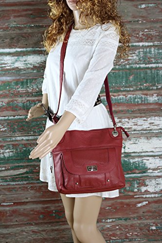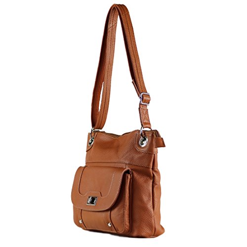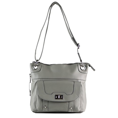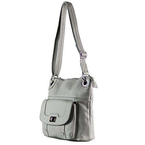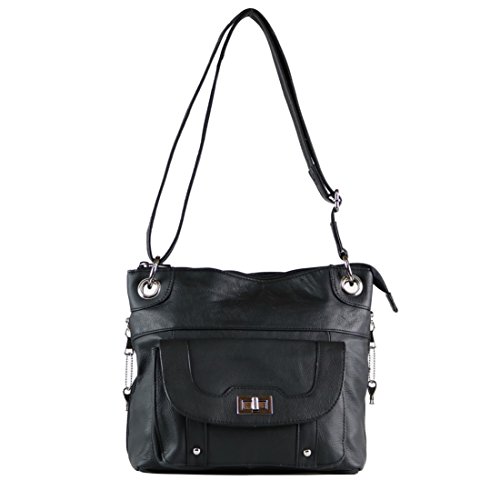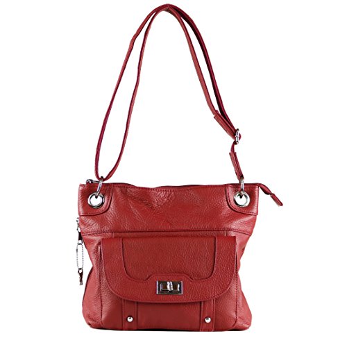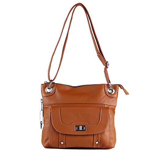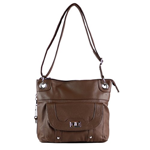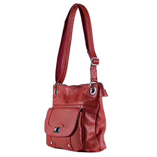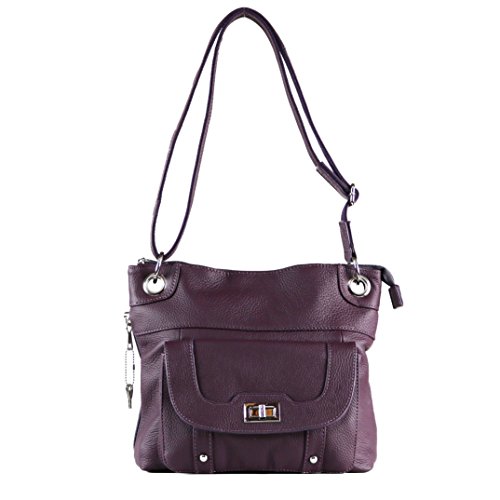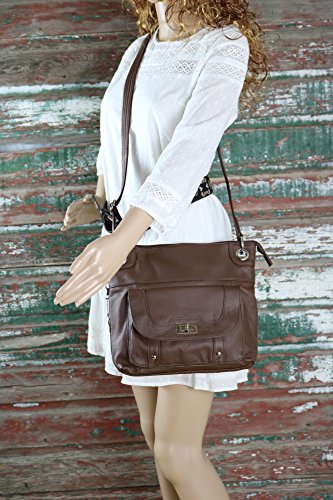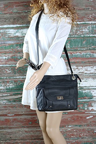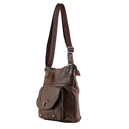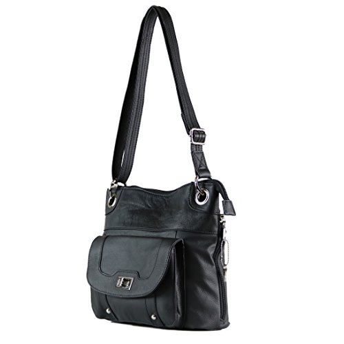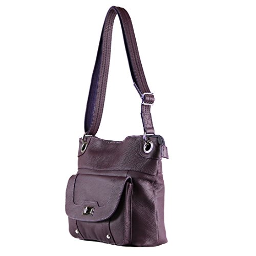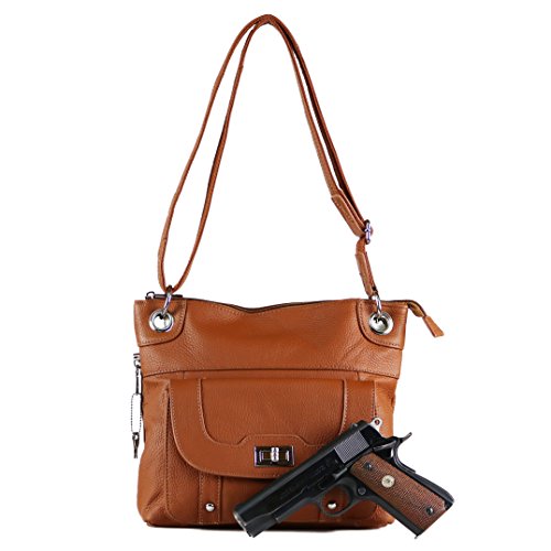 Product Description Product Summary: Just because you carry a handgun doesn't mean you need to sacrifice style for safety. This attractive concealed carry crossbody bag by Roma Leathers is crafted with premium top grain leather and features a decorative front flap pocket with a twist lock buckle. The main zippered compartment includes 2 open pockets on one side and a secure zippered compartment on the other. The wire reinforced adjustable shoulder strap can be shortened for shoulder carry or lengthened for crossbody carry. A back zippered pocket is located on the back for additional necessities. Concealment Pocket Specifications: The concealed carry compartment located on the back, can be accessed from the right, measures approximately 6" x 11" and features a locking YKK zipper with 2 keys for added security. This compartment is constructed of ballistic nylon and can accommodate a medium frame handgun. An adjustable holster is included, and features Velcro hooks on both sides for a secure fit in the concealed carry pouch. Purse Dimensions: 11" L x 10 H x 2.5." W (Adjustable strap 26"- 47"/Drop 11-22") 0