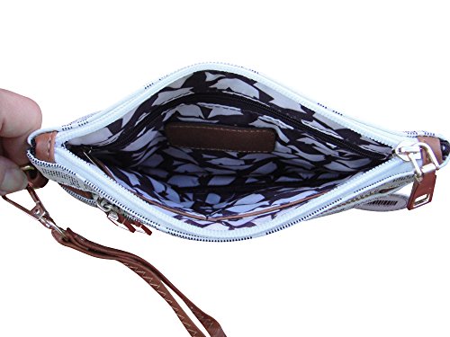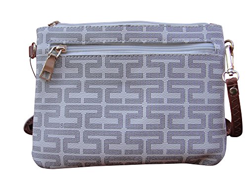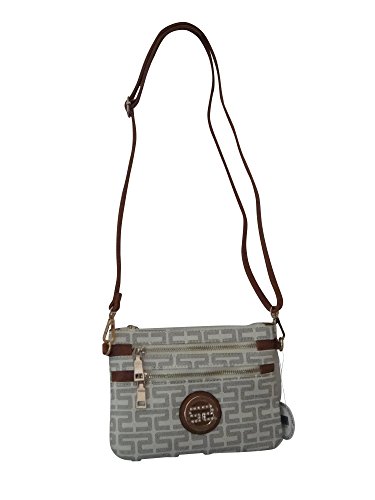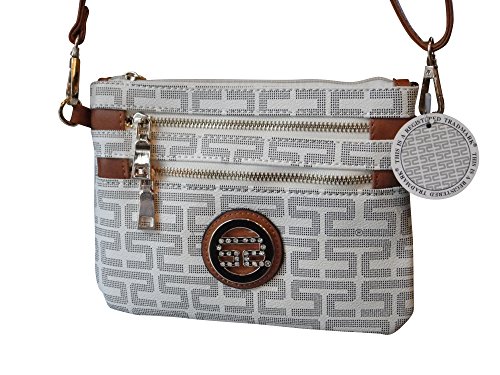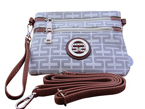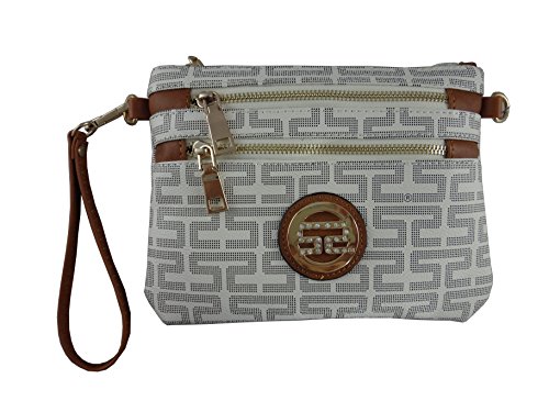 ♦ This handbag comes in 2 different colors: Beige and Brown. PU Faux Leather Accented Gold Metal Rounded Emblem Small Cross-body Handbag with Removable Strap and Wrist Strap Clutch. 3 extra outside zippered pockets for your 3 compartments. High Quality Fabric Lined Interior with Multiple Interior Pockets. 2 Pockets Open and 1 Pocket with Zipper inside. It comes with 1 detachable 13" drop strap; 1 PVC leather crossbody strap adjustable up to 25" drop.