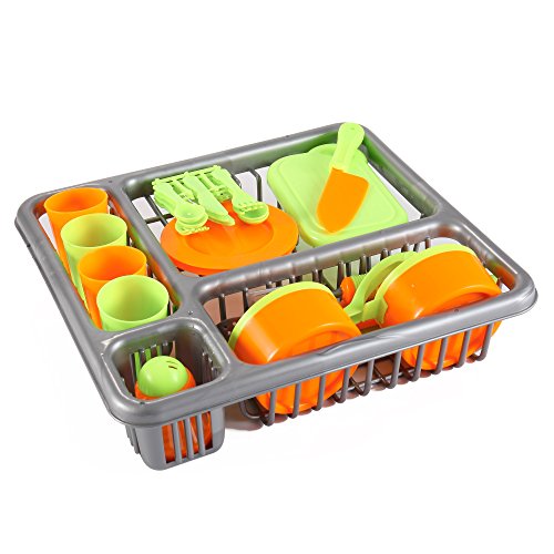 -. Feature : 28 Piece Play Dishes set with dish drainer / Includes 4 cups, forks, knives, spoons, plates, cutting board, kitchen knife / 2 Pots with Lid, Spatula, Ladle, Serving Spoon, Strainer, Dish Rack / Made of Lightweight Durable Plastic / Ages 3 and Up