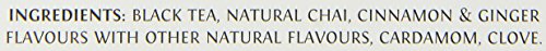 -. Feature : Black tea blended with cinnamon, cardamom, cloves, and ginger / Tea leaves are processed within 24 hours of being plucked / Black tea; natural chai; cinnamon; cardamom; cloves; ginger / Fine black tea perfectly balanced with sweet and savoury spice flavours of cinnamon, cloves and ginger / Ingredients: Black Tea, Natural Chai, Cinnamon & Ginger Flavours with Other Natural Flavours, Cardamom, Clove
