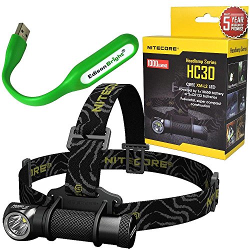 Nitecore HC30 1000 Lumens CREE XM-L2 U2 LED dual-form compact headlamp bundled with EdisonBright USB powered LED reading light