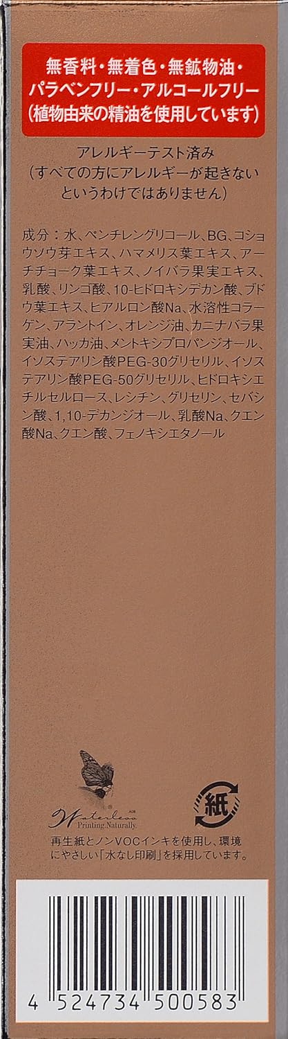 水、ペンチレングリコール、BG、コショウソウ芽エキス、ハマメリス葉エキス、アーチチョーク葉エキス、ノイバラ果実エキス、乳酸、リンゴ酸、10-ヒドロキシデカン酸、キダチアロエ葉エキス、ブドウ葉エキス、ヒアルロン酸Na、水溶性コラーゲン、アラントイン、オレンジ油、ローズヒップ油、ハッカ油、メントキシプロパンジオール、イソステアリン酸PEG-30グリセリル、イソステアリン酸PEG-50グリセリル、ヒドロキシエチルセルロース、レシチン、グリセリン、セバシン酸、1,10-デカンジオール、乳酸Na、クエン酸Na、クエン酸、フェノキシエタノール