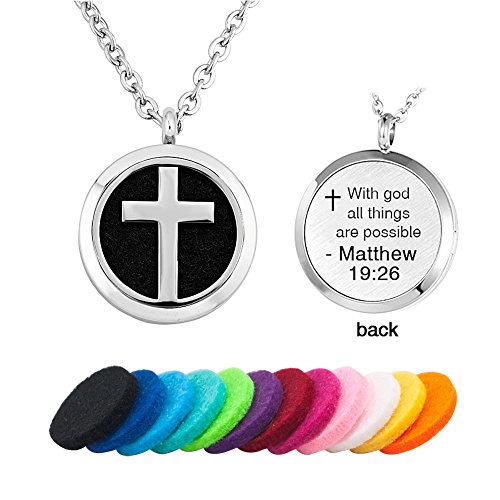 Third Time Charm Aromatherapy Essential Oil Diffuser Religious Cross Necklace With God All Things Are Possible Locket Pendant, 12 Refill Pads