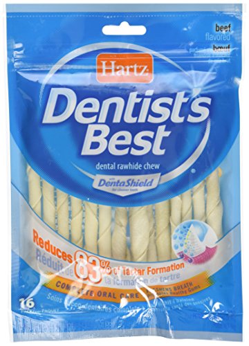 -. Binding : Misc. -. Brand : Dentist's Best -. EAN : 0032700003708 -. Feature : Hartz Dentist's Best with DentaShieldTM rawhide is scientifically proven to reduce tartar up to 83%. / Carpet safe rawhide chew is coated with beef flavor that dogs love. / Provides complete oral care and freshens breath. / Satisfies the natural desire to chew, and gently massages your dog's gums while helping to minimize plaque and tartar. / Includes 16 mini rawhide twists. -. Label : Dentist's Best -. Manufacturer : Dentist's Best -. Model : 3270000370 -. MPN : HRZ-020 -. PackageQuantity : 16 -. PartNumber : HRZ-020 -. ProductGroup : Pet Products -. ProductTypeName : PET_SUPPLIES -. Publisher : Dentist's Best -. Size : 5" -. Studio : Dentist's Best -. Title : Hartz Dentist's Best Beef Flavored Mini Rawhide Twists Dental Care Dog Treats - 16 Pack -. UPC : 032700003708