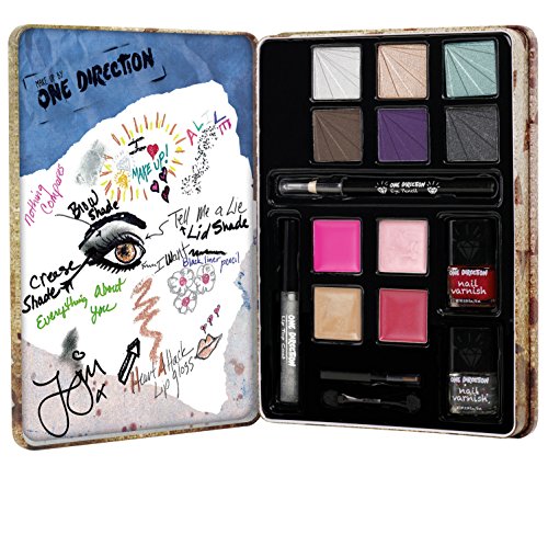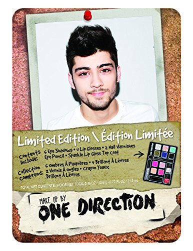 -. Feature : Includes full palette of shadows complemented by a quad of shimmering lip gloss, glitter eye pencil and two incredible nail lacquers / Exclusive doodles and instructions customized for each band member / Exclusive photo of Zayn / Limited edition collectible tin / Make Up by One Direction is fun, bold, often Irreverent with a touch of cheeky mischievousness