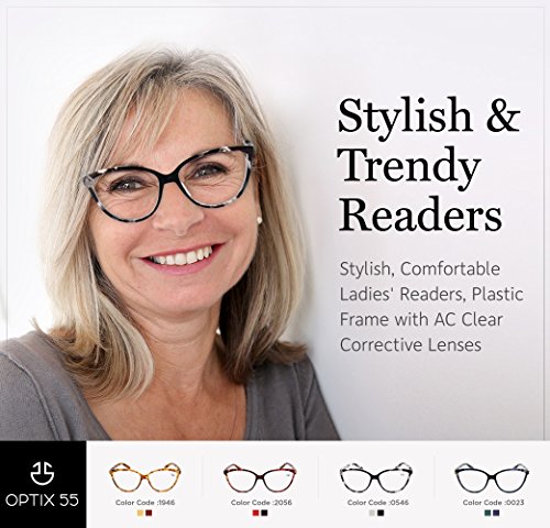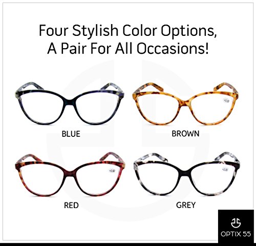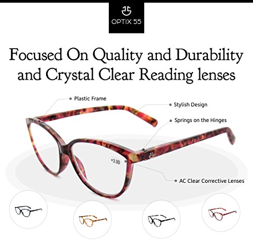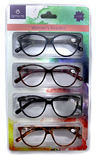 Product Description Gone are the days of bulky, unattractive reading glasses that are more cumbersome than vision-clarifying. Optix 55 now provides you with readers so stylish and comfortable that you will actually look forward to wearing them. PRODUCT FEATURES: ? Pack of 4 women's Reading Glasses ? Dimensions: 53-14-140 ? Wayfarer Style ? Clear Lenses ? Classic Tortoise Shell Pattern in 4 Colors: - Red - Blue - Gray - Light Brown PUT THE "FUN" IN FUNCTIONAL Our Women's Readers feature horn rimmed wayfarer style lenses that comfortably cover the surface of the eye while delivering a dose of style. Narrow temples sit gently over the ears without "digging" into skin or leaving marks. Each of our 4 packs includes four fun, versatile colors in a classic tortoise shell design that coordinates easily with any outfit, making them suitable for any occasion. As stylish as these frames are, they are also functional. Choose from 7 prescription strengths to best suit your vision correction needs: 100, 150, 200, 250, 300, 350 and 400. Harness this prescription strength vision-correcting power at a fraction of the price of the doctor's office! Even for those who already own a pair of readers from the doctor, these Women's Readers are great to have as spares as well as to keep handy in multiple locations. 7 Prescription Strengths: - 100 - 150 - 200 - 250 - 300 - 350 - 400 OPTIMAL SATISFACTION Optix 55, as a brand, specializes in all eyewear needs with premium quality products. Our frames are both functional and fashionable. Confident in the quality of our eyewear, we back up our products with a 100% satisfaction guarantee. If for any reason you are not completely happy with your purchase, please contact a customer representative and let us improve your experience. And of course, if you love your new readers, we want to hear that too! 0