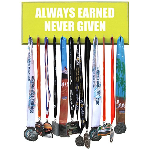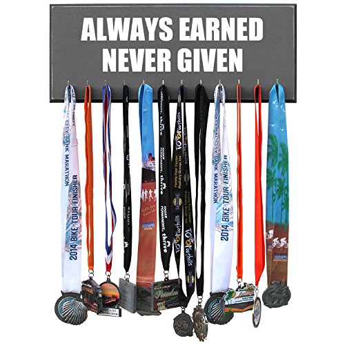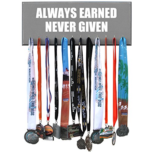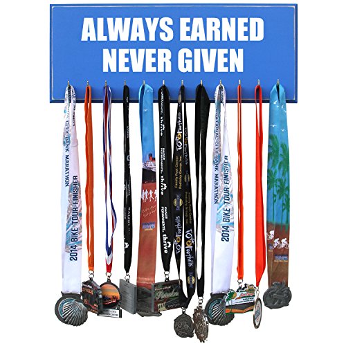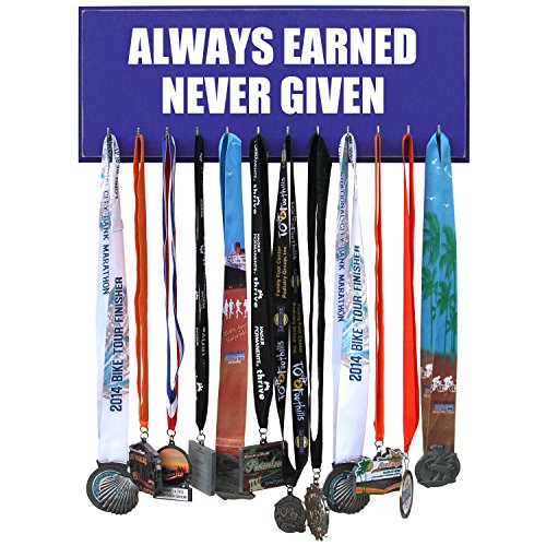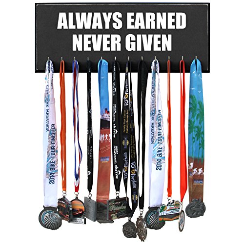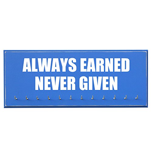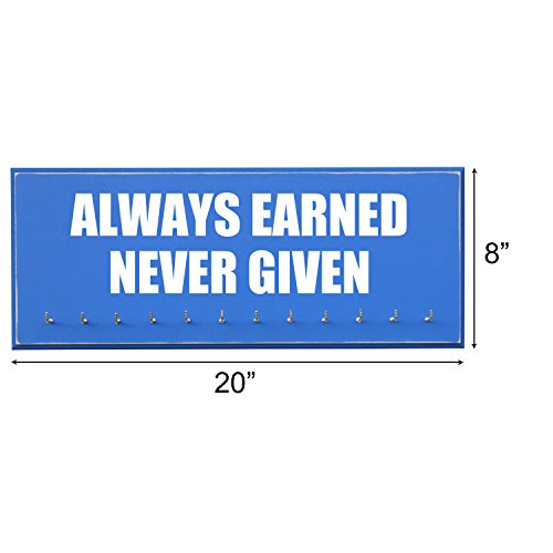 -. Feature : Handmade in the USA. 20 inches X 8 inches X 3/4 MDF Wood. / 12 hooks to show off your medals. / Assembly of hooks are required. Hooks are removed to prevent damage during shipment. Holes are pre-drilled so the hooks can easily be installed. / Hand painted, beveled and distressed edge, premium vinyl lettering and 2 sawtooth hangers. / Color unevenness and distress appearance may vary from the picture.