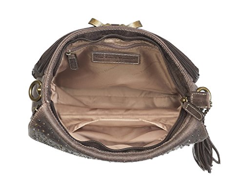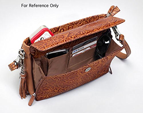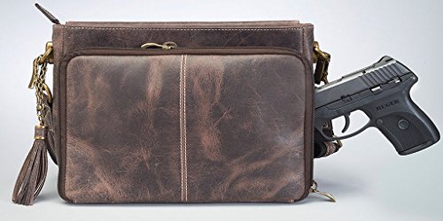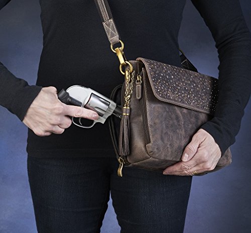 This full grain distress buffalo leather crossbody purse by Gun Tote'n Mamas is vintage tanned leather at its finest. Chrome, bronze and gun metal rivets decorate the front flap. The slash resistant shoulder strap can be adjusted from a 12" to a 25" drop. The fully lined top zippered main interior compartment includes a side pocket and a zippered privacy pocket. The top flap opens up to an organizer with lots of credit card slots and open pockets for cell phone and daily necessities. The side of this organizer zips for easier access, and the flap has a convenient magnetic snap. A detachable leather tassel adorns the front. The concealed carry compartment is designed for right or left handed use, zips open on 3 sides, measures approximately 10" L x 6.5" H and features an adjustable holster to fit your comfort draw angle. This compartment is constructed of ballistic nylon and can accommodate a medium to large frame handgun. A universal holster is included, and features Velcro hooks on both sides for a secure fit in the concealed carry pouch. Purse Dimensions: 10.25" L x 8" H x 3.5" W / Adjustable 49" strap (adjusts from 12" to 25" drop)Feature