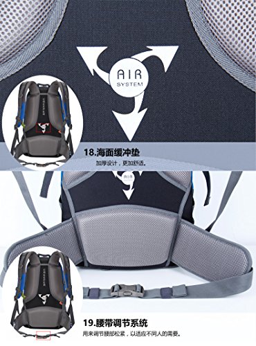 -. Feature : Height: 60cm, width: 36cm, thickness: 22cm / Suitable for the environment: professional mountaineering, long-distance travel, camping, camping / Fabric: 420D nylon jacquard fabric, +420 nylon lattice, 3D honeycomb breathable mesh, decompression breathable pearl cotton, earthquake resistant EVA layer, Oxford cloth / Commodity function: 1., distribution rainproof cover, 2. suspension air flow system, 3., multi compartment, more items / Main material is mesh abrasion resistant nylon