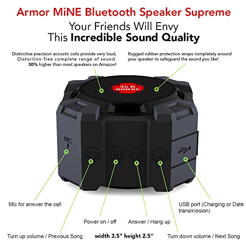 -. Binding : Wireless Phone Accessory -. Brand : ARMOR MiNE -. Feature : UNIVERSAL WIRELESS BLUETOOTH SPEAKER: Works with iPhones, iPads, iPods, smart phones, tablets, MP3, MP4 players or any of your Bluetooth-enabled digital players / HI-DEF BASS GIVES YOU BIG SOUND IN A SMALL PACKAGE: Delivers the rich bass and sound quality you want thanks to the passive subwoofer and two 40 mm drivers; Electro-acoustic efficiency 30% higher than average speakers / WATERPROOF SHOCKPROOF DUSTPROOF: Red and durable silicone housing protects speakers from corrosion, shorting and tumbling off tables or counters; Waterproof level IPX5- Protected against low pressure water stream from any angle. (Not submersible) / EASY HANDS-FREE MUSIC STREAMING AND SPEAKER PHONE: Power functions - Volume up / Volume down / Fast forward (skip) / Backward / Pause / Play / Power On/Off / RECHARGEABLE 500mAh LITHIUM ION BATTERY: For high definition seamless streaming and four hours of uninterrupted playtime; USB charging or data transmission -. Label : MINE LLC -. Manufacturer : MINE LLC -. PackageQuantity : 1 -. ProductGroup : Wireless -. ProductTypeName : WIRELESS_ACCESSORY -. Publisher : MINE LLC -. Studio : MINE LLC -. Title : Bluetooth Speaker for iPhone and Other Mobile Devices, Waterproof, Red, Shockproof, Dustproof, Indoor/Outdoor, Hi-Def Bass, by ARMOR MiNE™