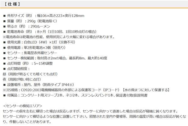 センサー左右角度、昼夜ツマミで夜だけ点灯もしくは昼も感知点灯、点灯時間(5~15秒)の調整ができます。前面電池ボックスなので、設置したまま簡単に電池交換ができます。 製造国:中国 仕様:保証期間:1年間 ※サプライヤー直送品 ご注文後2~3営業日後の出荷となります【商品名】オーム電機 OHM E-Bright 乾電池式4W×1灯 LEDセンサーライト LS-B145B-K