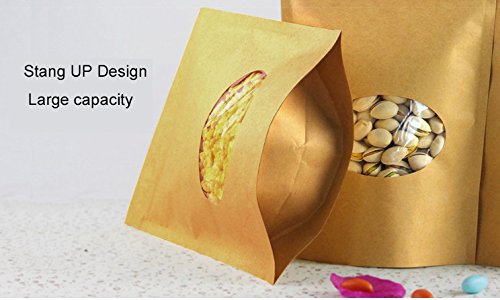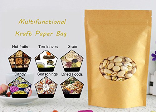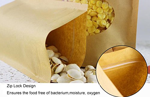 With Zip lock,oval window and tear mouth design,the kraft paper bags are good for packing,storing,displaying foods,like nut-fruit,candy,cookies,tea leaf,dried foods,snacks,etc