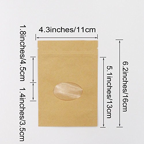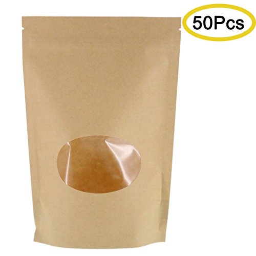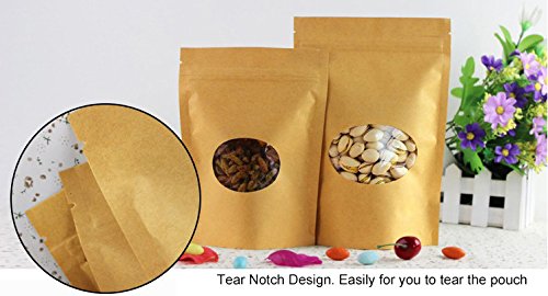 SumDirect 50Pcs Kraft Paper Bag Zip Lock,Stand-up Reusable Sealing Bag with Transparent Window and Tear Notch for Storing ,Cookie,Dried Foods,Snack (4.3"x 6.2")