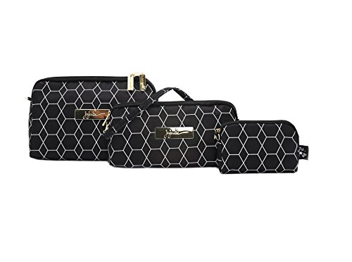 The Ju-Ju-Be Legacy Collection Be Set includes (3) bags for triple the fun, fashion and function! You ready? Then get set to go wild over this newly revamped ensemble of baglets. We just made up that word, but that's what they are'three super cute little bags of different sizes that give you a head start when you're racing off to the next event. The large bag measures 9-inches by 6.5-inches by 2.5 inches, the medium measures 9-inches by 4.75-inches by 1.75-inches and the small measures 5.5-inches by 3.5-inches by 1-inch. Three sizes help conveniently organize all your stuff - from diaper bag contents to makeup! The inner lining is protected with an Agion natural antimicrobial treatment that inhibits and reduces the growth of odor-causing bacteria, mold and mildew. The outer fabric is treated with Teflon fabric protector, making it easy to repel stains and keep the Be Set bags clean. The lining is light colored so you can easily see your belongings, and all hardware is metal. Locking slider zippers keep things out of reach from curious toddlers, too (lock not included). The Set comes with (2) straps - an extender strap to convert a bag into a mini shoulder purse and a clip on strap for use as a wristlet or to attach to another bag or stroller. Machine wash and air dry. The Duchess print is black with white polka dots and is accented by light colored lining. The print is accented by gold, metal hardware. All Ju-Ju-Be Bags come with a Lifetime Limited Warranty against manufacturing defects when purchased from an Authorized Ju-Ju-Be Dealer. Authorized Dealers can be found in the images. Founded in 2005, Ju-Ju-Be is a Southern California company that uses science, style, and attitude to create diaper bags, purses and other fashionable accessories. Ju-Ju-Be assimilated the most advanced technology possible to create a stylish and intelligent product line that's unrivaled in the industry.Feature