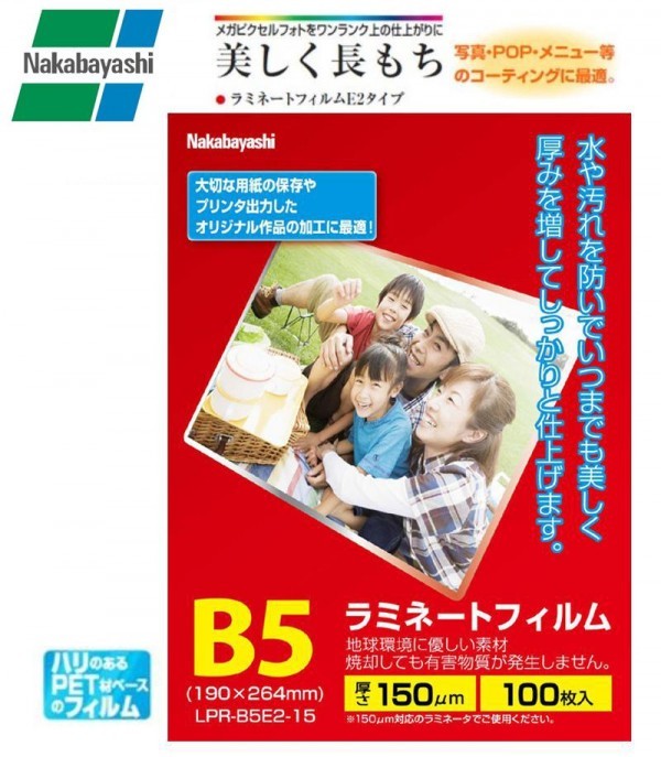 油性マジックならフィルム面にも記入OKのラミネートフィルムです。ハリのあるPET材ベースのフィルム。 製造国:中国 素材・材質:PET+EVA 商品サイズ:B5:190×264mm 仕様:B5 100枚入厚さ:150μm※しっかりした厚み ※サプライヤー直送品 ご注文後3~4営業日後の出荷となります【商品名】ナカバヤシ ラミネートフィルム E2 150ミクロン100枚 B5 LPR-B5E2-15 793939
