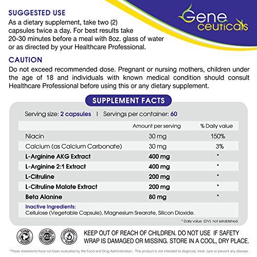 Potent L-Arginine Supplement – 400 mg Vegetarian Capsules - Faster Muscle Growth - Increases Nitric Oxide Levels – Added L-Citrulline and Calcium – 100%...