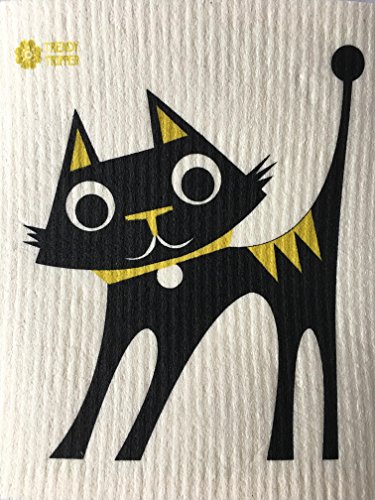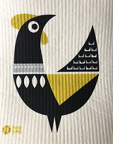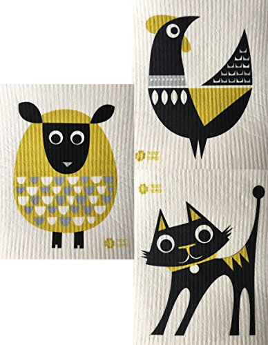 Swedish Dishcloths, Set of 3 DARK YELLOW GOLD-BLACK-GREY - Sheep + Rooster + Cat