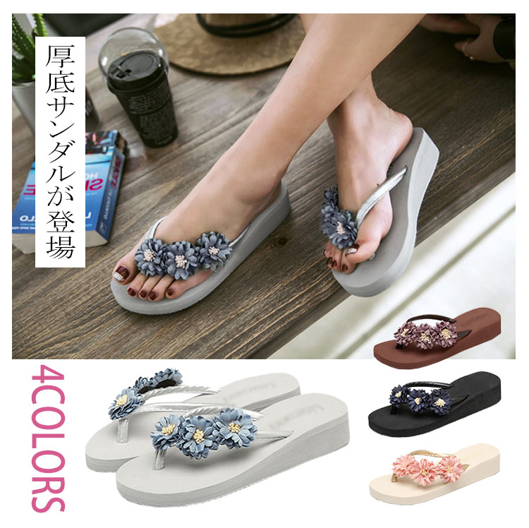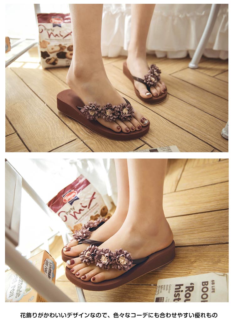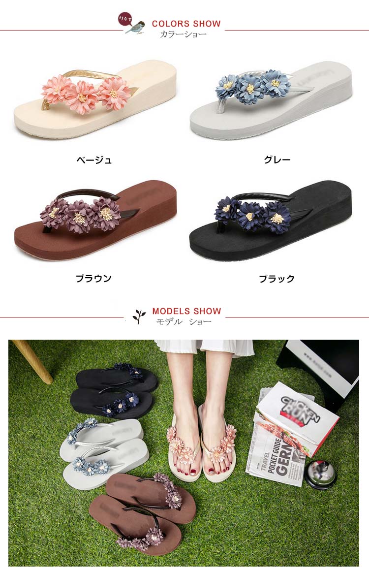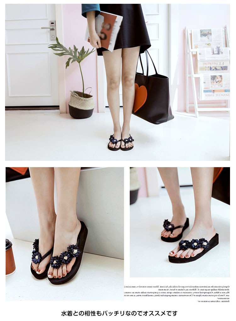 | 厚底サンダルが登場美脚効果バツグンのヒールが嬉しい花飾りがかわいいデザインなので、色々なコーデにも合わせやすい優れもの水着との相性もバッチリなのでオススメです | |