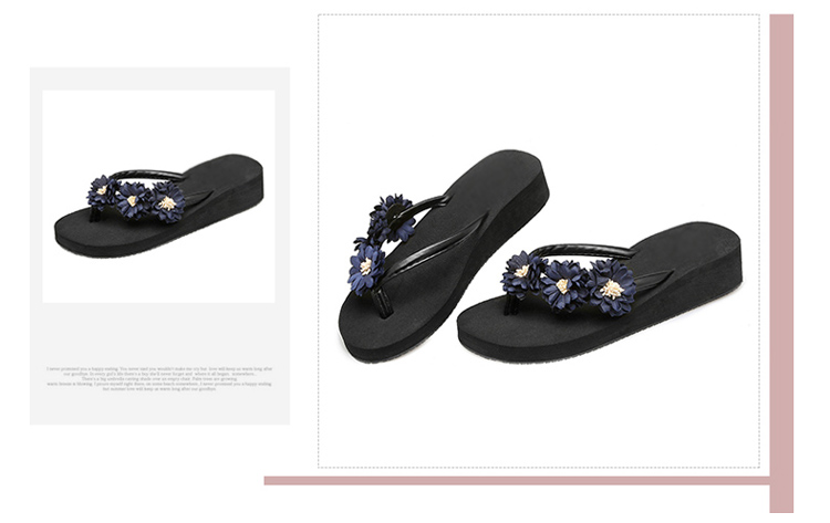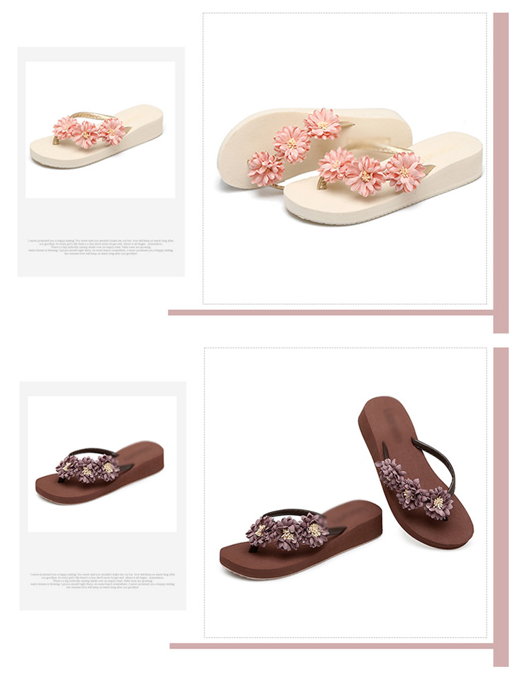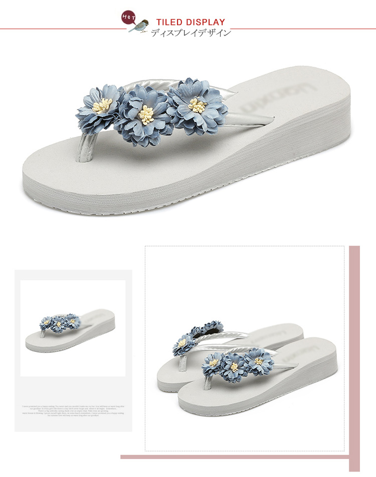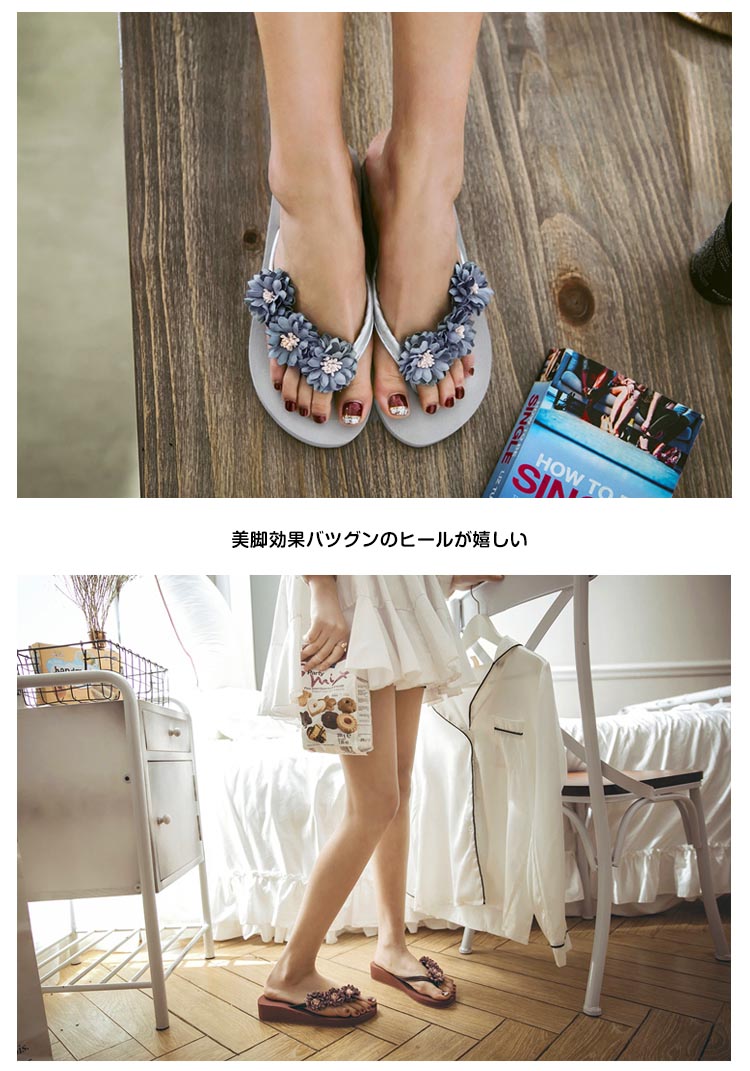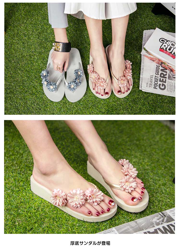 | 厚底サンダルが登場美脚効果バツグンのヒールが嬉しい花飾りがかわいいデザインなので、色々なコーデにも合わせやすい優れもの水着との相性もバッチリなのでオススメです | |