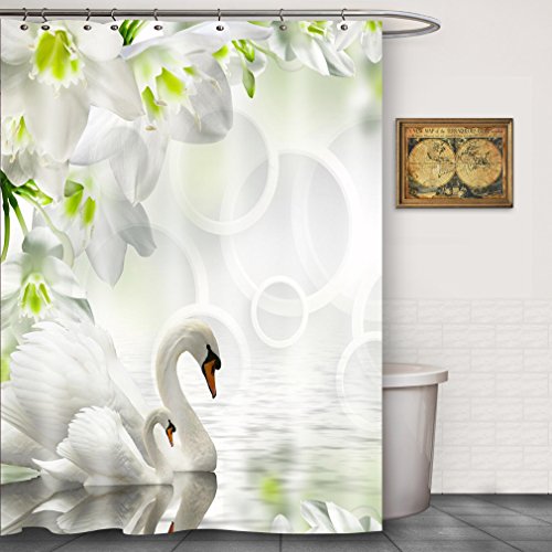 FOOG White Swan in the Lake Fabric Shower Curtain Sets Spring Floral Polyster Mildrew Resistant Home Bathroom Decoration - Green Branch White (70"Wx78"L)