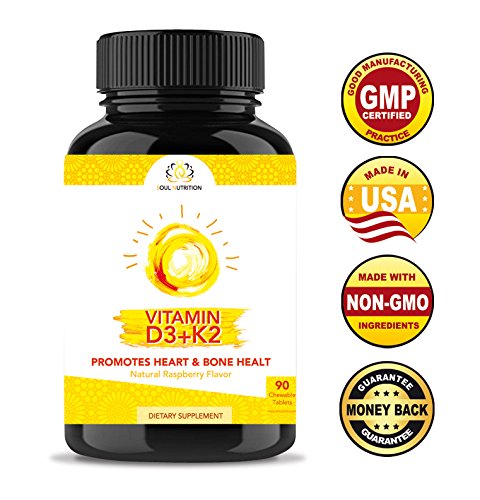 Vitamin D3 & K2 Complex - Bone and Heart Health Formula - 5000 IU Vitamin D3 & 90 mcg Vitamin K2 MK-7 - Supplement - 60 Chewable tablets (Raspberry flav.) - Small & Easy to Swallow