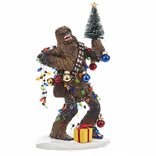 Studio : Kurt Adler Publisher : Kurt Adler Binding : Kitchen Product Description This 8-Inch star wars Chewbacca table piece from Kurt Adler is a fun and festive addition to any holiday decor. Perfect for star wars fans and collectors, Han solo's wookiee buddy chewy is featured here, standing tall and wrapped in a string of Christmas lights. He is wearing a Christmas Bow like a Bow tie, and is holding a small green tree over his head. Ornaments hanging from his fur lends an extra festive look to chewy 0