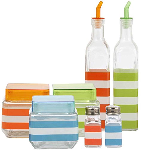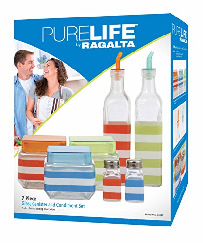 PureLife 7 piece Glass Colorful Air Tight Lids Canisters and Condiment Set Pouring Spout Oil Dispenser and Vinegar Jar Salt and Pepper Containers Shakers. All in One!!!