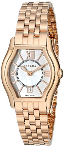-. Binding : Watch -. Brand : Escada -. Color : Rose Gold -. Department : womens -. EAN : 0805755803469 -. Feature : Tonneau watch with mother of pearl dial featuring date window, Roman numeral indices, and smooth crown / 26 mm rose gold-tone stainless steel case with mineral dial window / Swiss quartz movement with analog display / Rose gold-tone band with deployant-buckle closure / Water resistant to 30 m (99 ft): In general, withstands splashes or brief immersion in water, but not suitable for swimming -. Label : Escada MFG -. Manufacturer : Escada MFG -. Model : IWW-E3705043 -. MPN : IWW-E3705043 -. PartNumber : IWW-E3705043 -. ProductGroup : Watch -. ProductTypeName : WATCH -. Publisher : Escada MFG -. Studio : Escada MFG -. Title : Escada Women's IWW-E3705043 Grace Analog Display Swiss Quartz Rose Gold-Tone Watch -. UPC : 805755803469