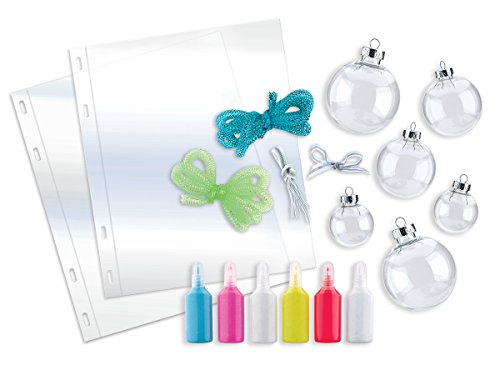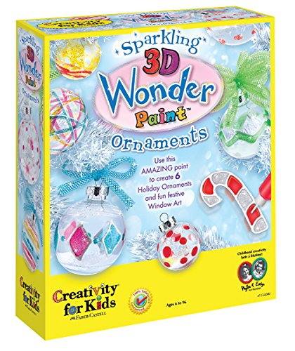 This complete holiday craft kit for girls and boys includes everything for a family crafting experience. With six kid-safe, shatterproof ornaments, it is a wonderful way to provide a little festive flair no matter the season or the occasion. Sparkling 3D Wonder Paint will add an extra dimension to your design to make them pop. We even provide you with festive holiday patterns to give each ornament a seasonally inspired look. Or create your own designs to reflect your creativity and individuality. Ribbon, Tooby Loops and snow foam pellets allow you to make all six ornaments unique. Give them away as gifts or add them all to your favorite holiday display for a cool, merry look. You may have extra paint left over, and that is okay! You can use the Sparkling 3D Wonder Paint on glass surfaces like mirrors or windows to add a cheerful touch to the room. Feel free to use our seasonal patterns or create a design that is truly your own. Complete craft kit includes: 6 clear, shatter-proof ornaments in three sizes, 5 tubes of 3D Wonder paint, 1 tube of pearly white 3D Wonder Paint, 4 feet of Metallic Organza Ribbon, 5 Feet or Metallic Tooby Loops, snow foam pellets and plastic project sheets.Feature