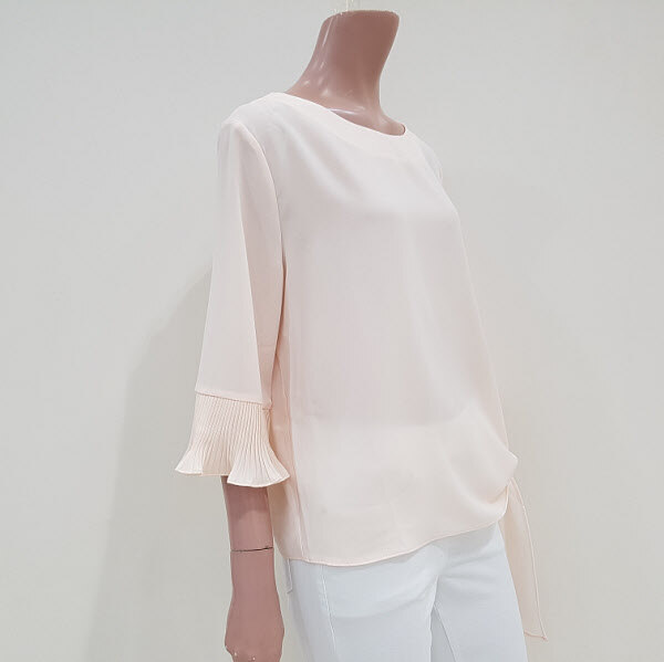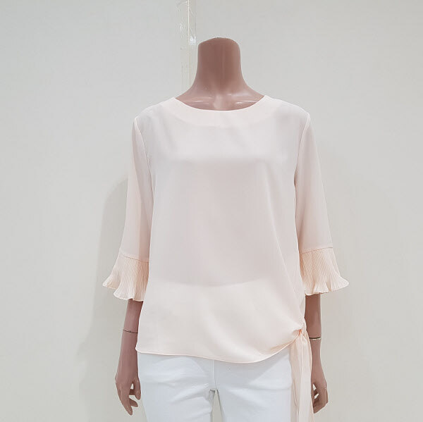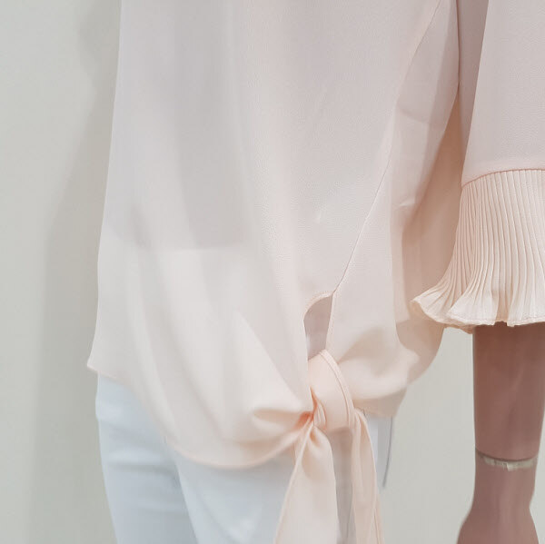 예쁜주름이 잡힌 나팔모양의 소매가 모던한 여성스러운 세련미가 돋보입니다ㆍ허리한쪽부분 매듭할수있는 포인트로 와이드팬츠ㆍ스커트ㆍ캐쥬얼스타일 어디에도 코디연출가능합니다