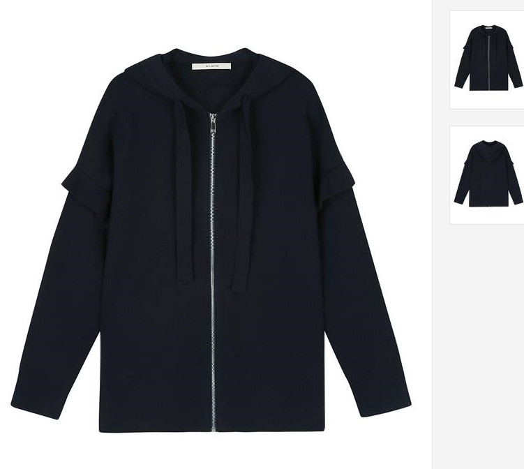 네이비 색상의 프릴 장식으로 귀여운 느낌을 주는 후드 집업 스웨터 입니다. 루즈한 핏 라인으로 편안하고 스타일리시한 연출이 가능합니다.