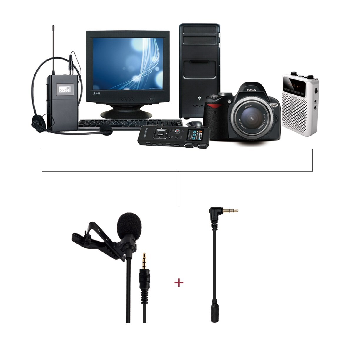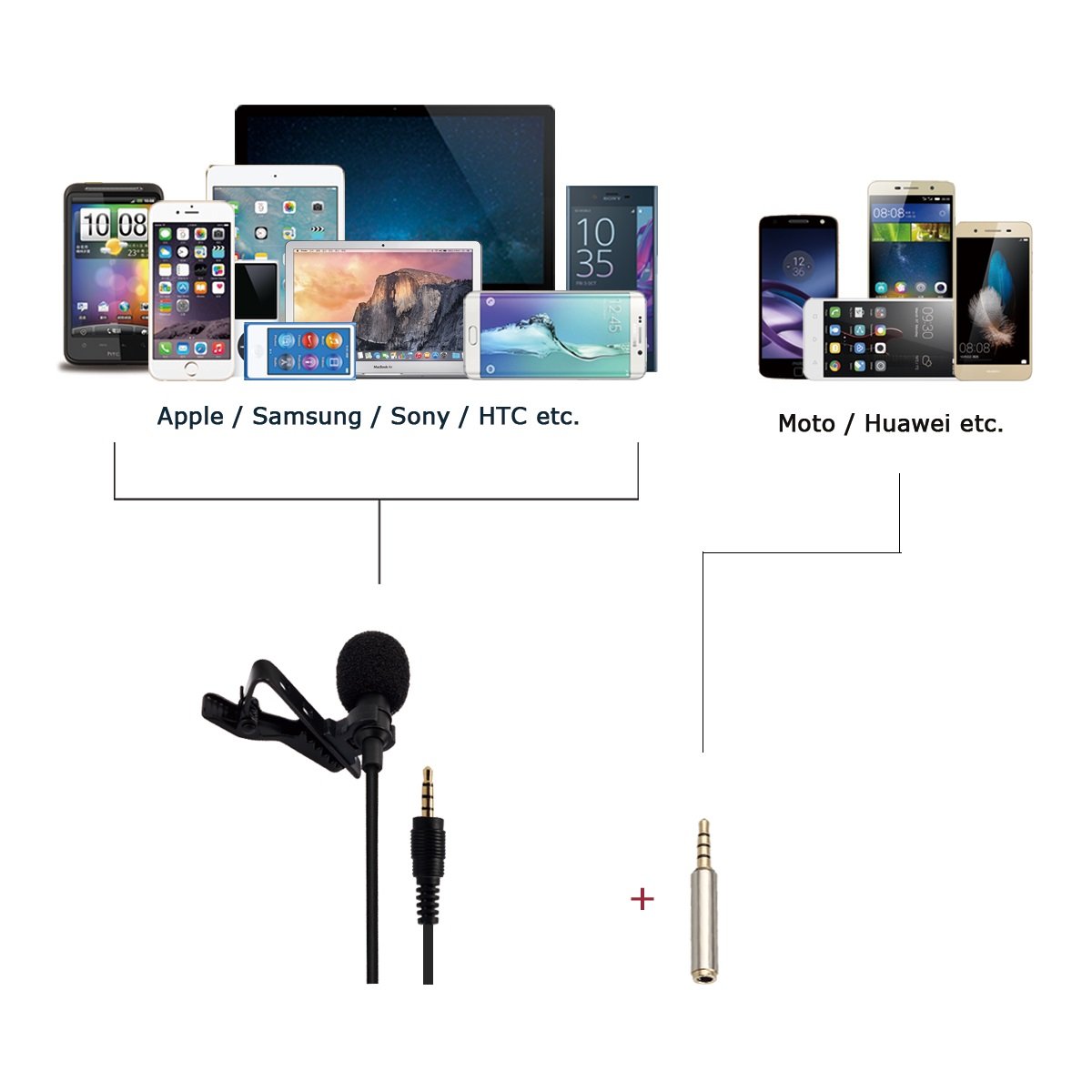 Connect with the included microphone adapter, not only cell phones / tablets, but also PC / loudspeaker / sound recording / camcorder and other models.