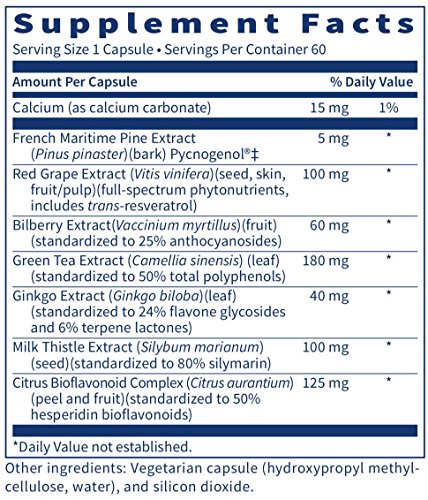 TheraFlavone 60 caps Dietary Supplement ProThera products may only be purchased by Health Care Professionals. Patients who want to buy ProThera products may obtain them from their Health Care Professional. Supplement Facts Serving Size 1 Capsule Servings Per Container 60 Amount Per Capsule Pycnogenol ** Pine Bark (Pinus maritima) 5 mg dried extract Red Grape 100 mg (Vitis vinifera) seeds skin and stems dried extract with resveratrol Bilberry 60 mg (Vaccinium myrtillus) fruit dried extract min. 25% anthocyanosides Green Tea (Camellia sinensis) leaf dried 180 mg extract min. 50% catechins (polyphenols) Ginkgo (Ginkgo biloba) leaf dried extract 40 mg min. 24% ginkgo flavone glycosides and 6% terpene lactones Milk Thistle (Silybum marianum) fruit 100 mg dried extract min. 80% silymarin Citrus Bioflavonoid Complex 125 mg min. 50% bioflavonoids Other ingredients: Vegetarian capsule (hydroxypropyl methylcellulose water) cellulose silicon dioxide and magnesium stearate. **Pycnogenol is a registered trademark of Horphag Research Ltd. Use of this product may be protected by one or more U.S. Patents and other international patents. Free of the following common allergens: milk/casein eggs fish shellfish tree nuts peanuts wheat/gluten corn yeast and soybeans. Contains no artificial colors flavors or preservatives. Suggested Use: 1 capsule twice daily with food. Do not use if full-bottle shrinkwrap is broken or missing. Store in a cool dry place (59 F-85 F) away from direct light. KEEP OUT OF REACH OF CHILDREN. This product was made in a GMP and ISO 9001:2008 registered facility.Feature