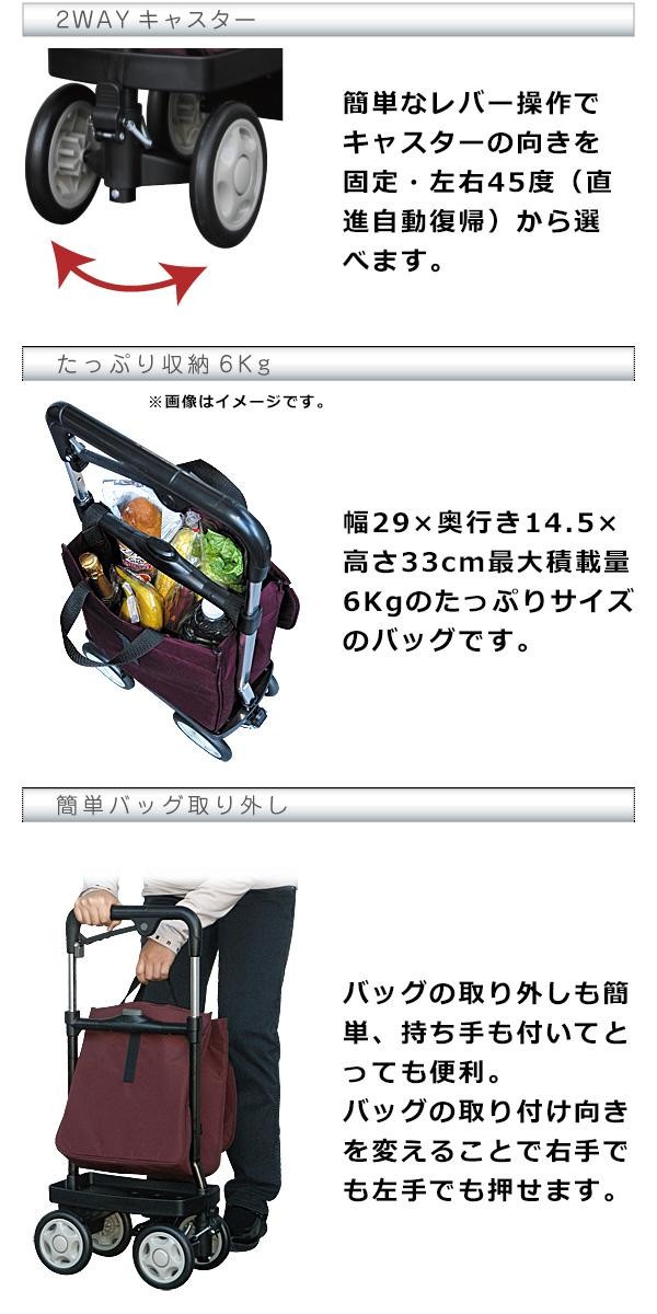 | 仕様 | SGマーク取得済 積載量:6kg バッグサイズ:幅29×奥行14.5×高さ33cm 車輪サイズ:直径13.5cm |