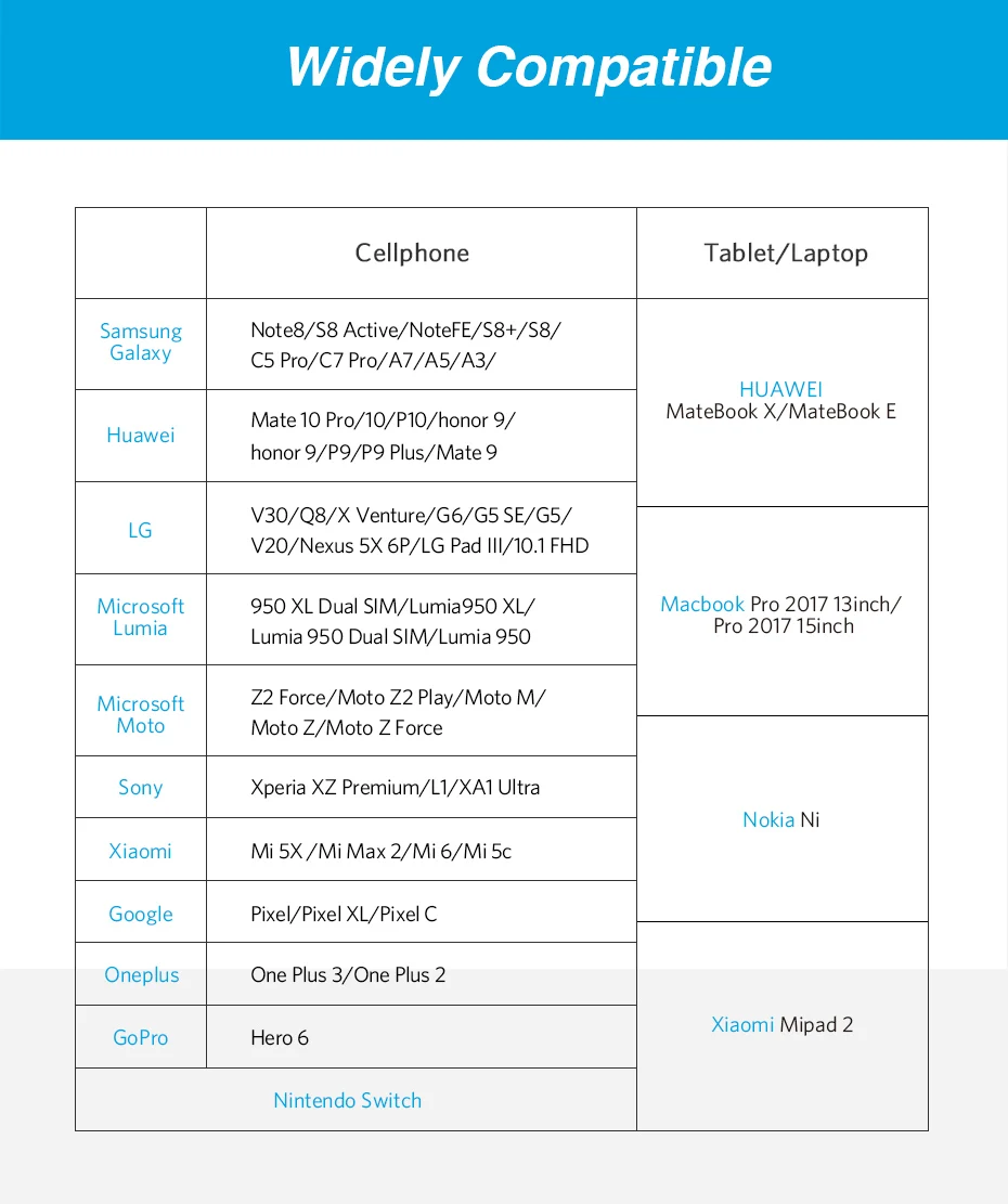 Compatible 1:Type C Cable for OnePlus 5/Nintendo Switch/Huawei Mate 10 Pro/10/P10