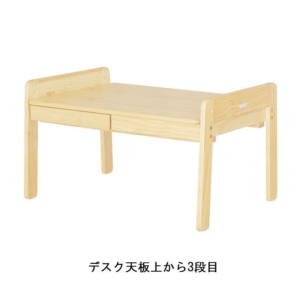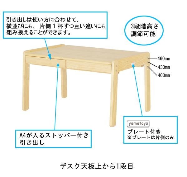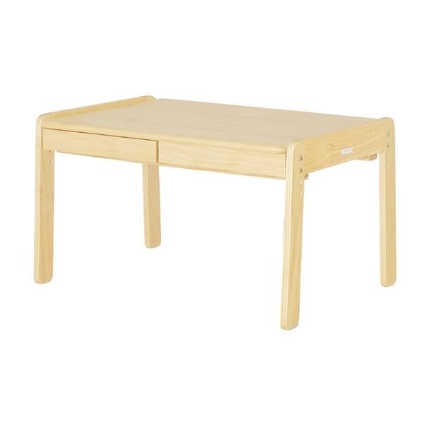 | 成長に合わせ、高さを3段階に調節できます。同じシリーズのリトルチェアを使うと高さもぴったりで、2脚が横並びに入るサイズです。引き出しが2杯付いており、その引き出しは使い方に合わせて横並びにも、片側1杯ずつ互い違いにも組み換えることができる仕様です。 |
