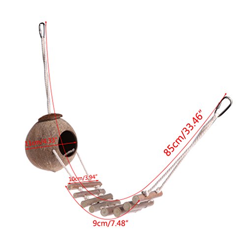Descriptions: Made with environmentally conscious hevea wood branches, coconut shell and natural sisal rope This bird toy encourages foot and beak exercise Toy connects easily to cage with quick-link attachments and is hand made Naturals toys are handmade from 100-percent natural, sustainable, materials Your bird will benefit from hours of mental stimulation and rugged physical play A variety of natural textures encourages foot and beak exercise Connects to cage easily with quick-link attachment Ideal for small to medium sized birds Naturals toys are handmade from 100-percent natural, sustainable, materials Your bird will benefit from hours of mental stimulation and rugged physical play Specifications: Material: coconut shell sisal rope Overall Length: 85cm Ladder Size: 19x10cm Coconut Shell Diameter: 11cm Quantity: 1 Pc Note: 1.Transition: 1cm=10mm=0.39inch 2.Please allow 0-3cm error due to manual measurement. pls make sure you do not mind before you bid. 3.Due to the difference between different monitors, the picture may not reflect the actual color of the item. Thank you! No Retail Package Package includes: 1 Pc x Bird Nest 0