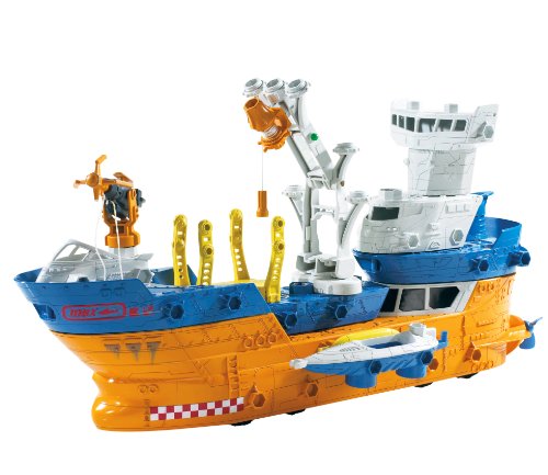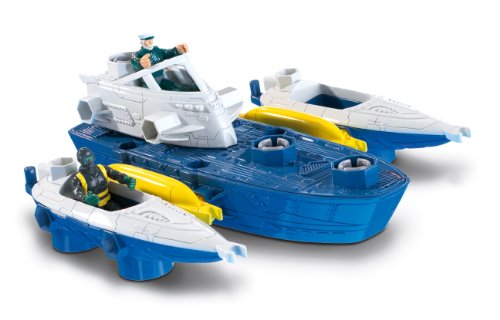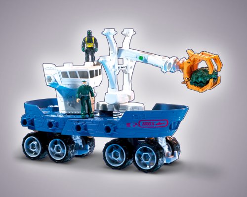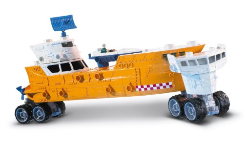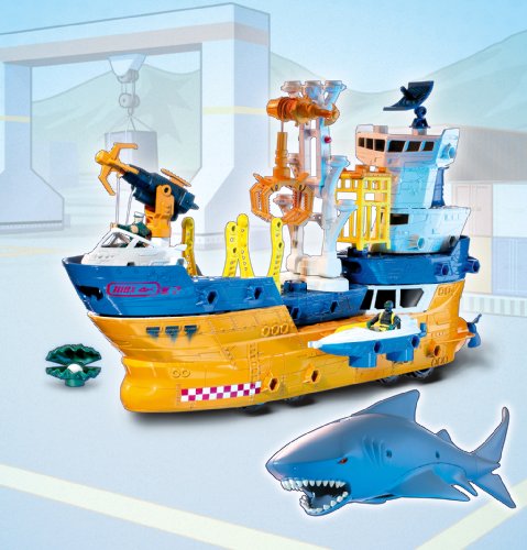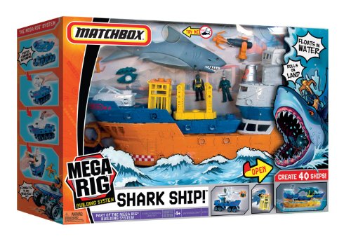 -. Feature : Assemble your Mega Rig crew and launch the Shark Ship! / Your mission is to rescue your diver from the jaws of an enormous shark! / Part of a building system, you can connect and combine your mega pieces to build over 30 vehicles! / Every boat has wheels and also floats - so play on land or in water! / Comes with huge boat, chomping shark, men, firing harpoon, and more!
