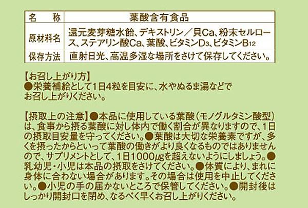 | 原材料 | 名称:葉酸含有食品 還元麦芽糖水飴、デキストリン/貝Ca、粉末セルロース、ステアリン酸Ca、葉酸、ビタミンD3、ビタミンB12 |