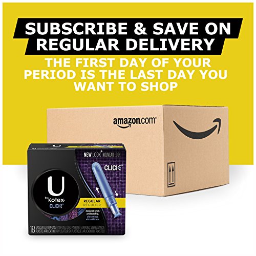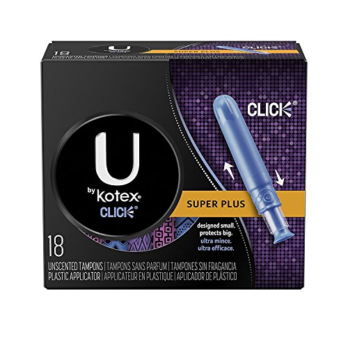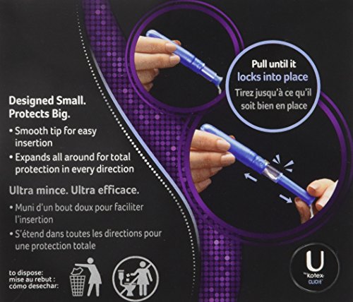 Get full-sized period protection in a small package! U by Kotex Click Regular Tampons are compact so you can discreetly carry one in your purse or pocket. Small in size but big on protection, these tampons go from compact to a full-sized tampon in one easy move. Pull the lower half of the tampon until you hear the click and then insert. Click Tampons are designed with a smooth tip for quick, easy insertion, and expands all around so you’re fully covered. These regular absorbency tampons are latex-free, lotion-free and fragrance-free and absorb 6-9 grams of fluid. Tampons are individually wrapped in three fearless colors to help you escape boring period protection. Need additional coverage? Use U by Kotex Barely There Liners for backup protection.Feature