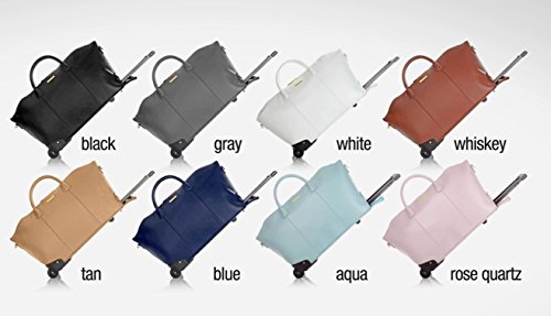 Product Description Grey Leather Carry-On Duffle; great gift for her! Oversized dome-shaped duffle with detachable shoulder strap Hardware: Front logo plate; goldtone Exterior: Genuine pebbled leather shell Interior: Polyester lining luggage- Approx. 20"L x 10-1/2"W x 14" H Approx. 4" handle drop Approx. 46" adjustable shoulder strap Handles: Double barrel; telescopic recessed; adjustable, detachable shoulder strap Wheels: In-line skate 0