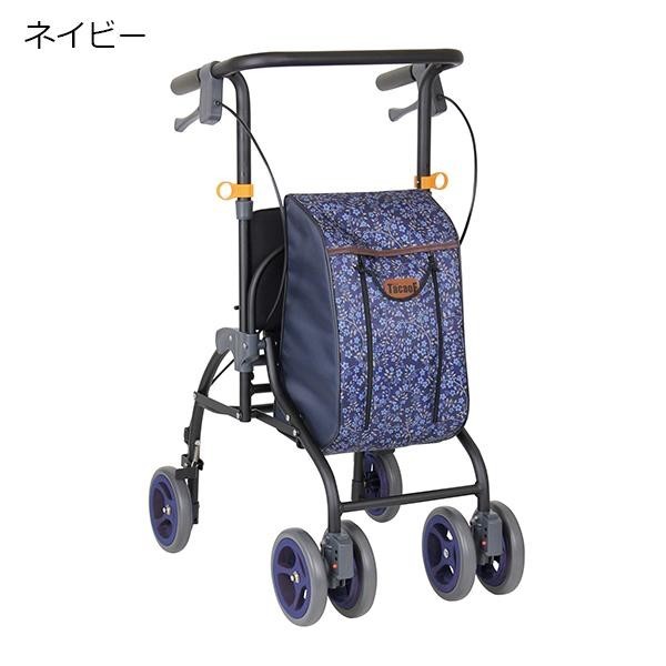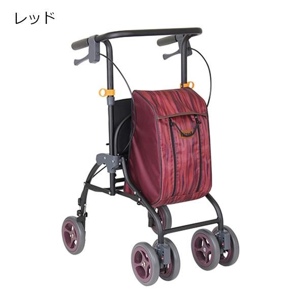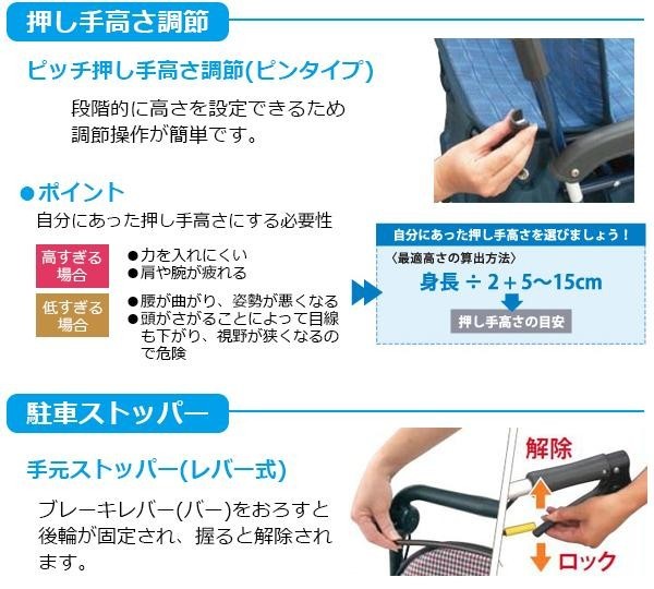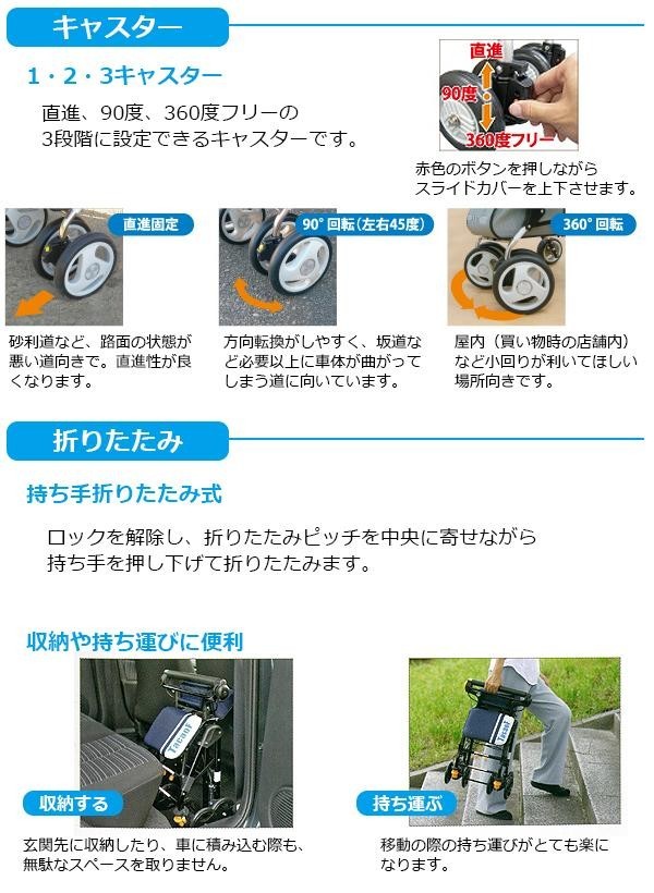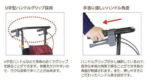 | 手首に優しいハンドル角度・高さにこだわり、自立歩行できる高齢者の方が、より安定して歩行できるように考えられたシルバーカーです。座面が押し手側に付いているので、歩行で疲れた時はすぐに座って休むこともできます。毎日のお買いものやお出かけにも最適です。 |