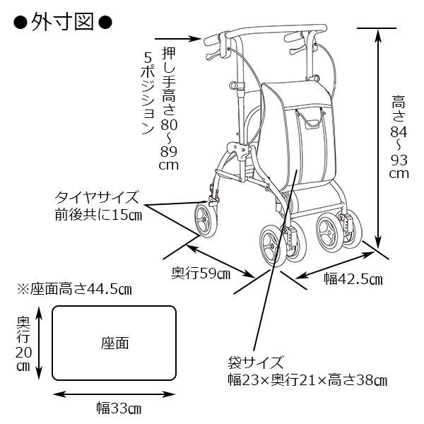 手首に優しいハンドル角度・高さにこだわり、自立歩行できる高齢者の方が、より安定して歩行できるように考えられたシルバーカーです。座面が押し手側に付いているので、歩行で疲れた時はすぐに座って休むこともできます。毎日のお買いものやお出かけにも最適です。 |