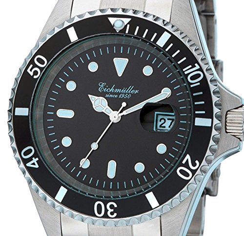 XL Sportliche Eichmüller Edelstahl Taucheruhr 20ATM 200m Herrenuhr mit Datumschnellverstellung in Lupenvergrößerung eingearbeitet im Uhrenglas In Silber matt - Metallic schwarz mit präzisen Quartz Citizen Laufwerk Die elegante Uhrenmarke Eichmüller steht für Qualität aus Deutschland - Germany seit 1950 Produktbeschreibung - Marke Eichmüller Taucher Armbanduhr - Farbe Silber matt - Metallic schwarz - Quarzuhrwerk: Citizen präzise mit Datumsanzeige - leuchtende Zeiger und Indexe bei Nacht - Gehäusedurchmesser 4,3 cm - Gehäusehöhe 1,1 cm - Gesamtlänge 23,5 cm - Armbandbreite 1,6 - 2,0 cm übergehend - Stegbreite 2,0 cm - IPS gehärtetes Mineralglas - Edelstahl Gliederarmband mit Faltverschluss Doppelsicherrung - Edelstahl Gehäuse massiv - Edelstahl Boden verschraubt - austauschbare Markenbatterie - Dichtigkeit 20ATM bis 200m - die Meter Angabe bezieht sich nicht auf eine Tauchtiefe, sondern auf den Prüfdruck, welcher im Rahmen der Wasserdichtigkeitsprüfung angewendet wurde - (ISO 2281).Feature