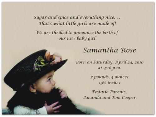 Studio : Storkie Express Publisher : Storkie Express Binding : Baby Product Product Description Birth Announcements: "Samantha" features an adorable little girl all dressed up in a light blue outfit with delicate, black stitching around the cuff. A black feather 0