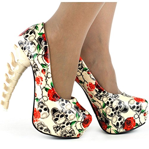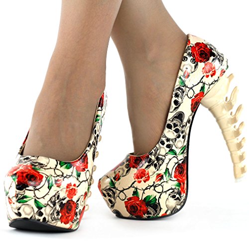 -. Binding : Apparel -. Brand : Show Story -. Department : womens -. Feature : closed toe platforms / personality dinosaur heels / Lightly padded insole / Please Use the Sizing Chart Image on the Left. / Sometimes, our estimated size is not the same as the labeled size due to large or small make of an item. -. Model : LF80610 -. ProductGroup : Shoes -. ProductTypeName : SHOES -. Title : Show Story Ladies Skull Rose Print Platform Bone Heel Party Club Pumps,LF80610